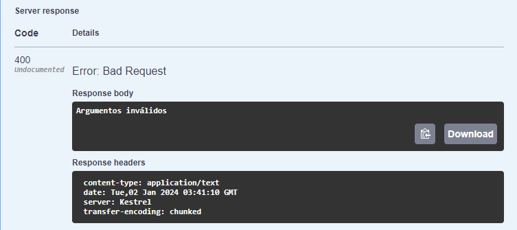 Ao executar a aplicação passo a passo, vamos reparar que a excessão será tratada como uma “ArgumentException” e retornar um erro 400 com uma mensagem “Argumentos Inválidos”.